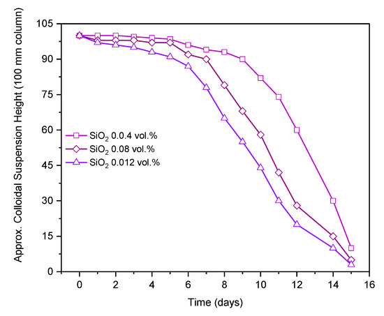 Nanofluid samples were perfectly stable for six days and complete sedimentation was observed after 11 days The suspension stability of the nanofluid samples was assayed using a visual sedimentation evaluation method, in which the samples were placed in 100 mm columns and the height of colloidal suspension was examined. The approximate height of colloidal suspension over the time is presented in Figure 13. Rate of sedimentation was observed to increase with the passage of time once the sedimentation had started. A rapid decline in suspension height can be observed in Figure 13.