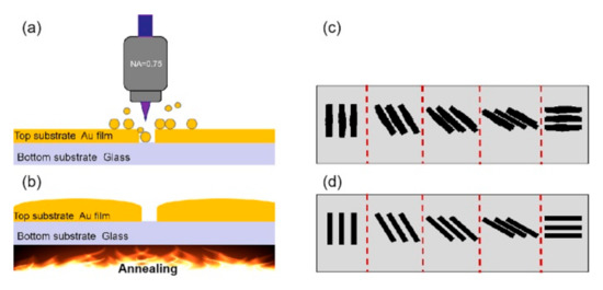 Schematic manufacturing flow of the geometric phase element on gold film by femtosecond–laser direct writing (a) and annealing (b); (c,d) schematic nanostructure before and after annealing.