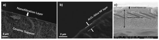 The two Al2O3-doped silica membranes reported in this study, namely S/O = 0.5 and S/O = 2, were coated from sols with the same Al2O3 + SiO2 loading (6.5 g L−1), but a different surfactant/oxide (S/O) molar ratio. From the previous study we found that among the Al2O3 doped silica membranes with different surfactant concentrations, the S/O = 0.5 has the highest selectivity while the S/O = 2 has the highest permeability [22]. It is not surprising that their final consolidated NF layers have similar structures, but different porosity. Indeed, the Al2O3-doped silica membranes have an asymmetric architecture (Figure 2a,b), which resemble that of the commercial polymeric NF90 (Figure 2c). The thickness of the Al2O3-doped silica selective layers is about 0.8 µm, but due to the different concentrations of the surfactant, the pores of S/O = 2 are more interconnected than S/O = 0.5. Nevertheless, according to the low-temperature N2 adsorption experiment from the former study, the pore size of the two membranes is similar at around 1−2 nm, and the specific surface area was at 695 and 685 m2/g for the S/O = 0.5 and S/O = 0.5, respectively [22]. On the other hand, NF90 has a smaller pore size (around 0.55 nm) and the thickness of the active layer at around 0.29 µm.