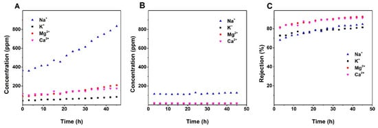 (a) Change of cations concentration of the feed and permeate (b) over time; (c) the change of ions rejection for the polymeric membrane NF90 over time.