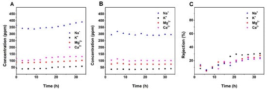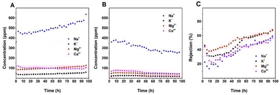 (a) Change of cations concentration of the feed and permeate (b) over time; (c) the change of ions rejection for the S/O = 2 over time.