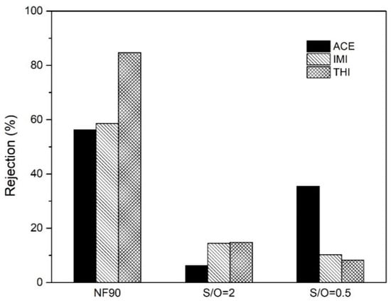 Rejection of acetamiprid (ACE), imidacloprid (IMI), and thiacloprid (THI) for the commercial polymer membrane (NF90) and the Al2O3-doped silica membranes (S/O = 2 and S/O = 0.5).