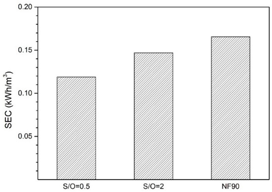 Figure 10 reports the specific energy consumption (SEC) for the three membranes, as calculated from Equation (1). The observed pressure drops for S/O = 2, S/O = 0.5, and NF90 were 0.014, 0.003, and 0.01bar, respectively whereas, the corresponding permeate flow rates, Qp, were 1.05 × 10−8, 3.24 × 10−9 and 7.41 × 10−9 m3/s, respectively. It is evident from the figure that S/O = 0.5 demonstrates the minimum SEC among the tested membranes. Qp for NF90 and S/O = 0.2 are, respectively, 56 and 69% higher than S/O = 0.5, however, the corresponding pressure drops for these membranes are even higher (70 and 78.5%, respectively). Consequently, S/O = 0.5 demonstrates the minimum SEC. NF90 is the most energy-consuming membrane among all the tested membranes due to its mediocre flux and relatively high pressure drop and demonstrates almost 1.4 times higher SEC than S/O = 0.5. The SEC values observed in the current study are similar or even slightly lower than what has been reported in the literature for similar feed water composition [34,35], thus indicating a good perspective of the applied Al2O3-doped silica membranes in desalination through NF. State-of-the-art polymeric nanofiltration membranes are in flat sheet configuration and require the use of spacers to support the membranes as well as to alleviate the concentration polarization within the module. The presence of spacers, however, causes additional pressure drop within the membrane module. Tube-shaped Al2O3-doped silica membranes used in the current study do not require any spacers and therefore, pressure drop within the module channels remains low. Relatively lower energy consumptions for ceramic membranes observed in the current study can be attributed to lower pressure drop compared to traditional flat sheet polymeric membranes where the applied spacers contribute significantly in total observed pressure drop [36].