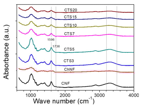 Figure 6 shows the FTIR spectra of the CNF, ChNF and ChNF–CNF composites with different ChNF concentration. The peak in the range of 3200–3500 cm−1 of the ChNF–CNF composites was assigned to the hydrogen-bonded O–H stretching in both CNF and ChNF. Chitosan showed broader O–H bonded as compared to cellulose with higher intensity. Due to the combination of these two materials, with 20% chitosan, the intensity of the peak at 3200–3500 cm−1 appeared similar to pure chitosan. The CNF showed stronger and higher peak of hydrogen-bonding than the ChNF. When ChNF and CNF were blended, peaks at 3000 and 3500 cm−1 were reduced, which might be due to the intra-bonding between two materials. The peak at 1596 cm−1 assigned for –C=O stretching is clear for CNF. The peak at 1736 cm−1 was assigned for the C=O stretch of the –COOH group. This was only observed in the CNF at first, and the intensity of this peak decreased due to the addition of ChNF. At last, this peak became weak and disappeared when the ChNF concentration increased. This phenomenon indicates the interaction between ChNF and CNF. The peak at 1596 cm−1 only appeared for cellulose and composites but not clearly shown for chitosan. This peak might be associated with the aromatic ring stretching of lignin or hemicellulose remained small amount in the bleached kraft pulp. From the FT-IR analysis, the structure of CNF and ChNFs were confirmed in the composites.