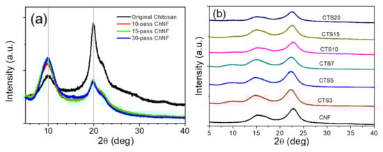 The crystallinity index (CrI) of the original chitosan and ChNF were obtained by XRD and calculated according to Equation 1 as shown in Figure 7a. The crystalline peaks of chitosan appeared at 9.7° and 19.7°. The peak at 19.7° decreased by the ACC treatment, while the strong peak at 9.7° increased, which might be associated with the incorporation of bound water molecules of α-chitin [38]. It means that a higher ACC treatment leads to more water molecules bound on hydrophilic surface of ChNF. The CrI values of the original chitosan and ChNFs with 10, 15 and 30 ACC passes were shown to be 65.4%, 44.0%, 44.0% and 36.2%, respectively. The CrI of chitosan highly degraded after ACC treatment. Note that 30 ACC passed ChNF was used for the ChNF–CNF composite preparation.
