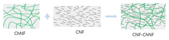 Nevertheless, the overall mechanical properties of the composite were improved, which might be due to the reinforcement of ChNF to CNF in the composite. Most previous studies produced cellulose–chitosan composites by dissolving chitosan or cellulose and blending them [2,32]. However, in this research, we adopted the non-dissolving method to prepare ChNF–CNF composites, and a remarkable improvement of the mechanical properties of the ChNF–CNF composite was observed. There could be several mechanisms that can explain the mechanical properties improvement of the composite. The first one is improvement of the bonding sites between ChNF and CNF due to different size of ChNF and CNF. Note that the ChNF size was larger than that of CNF. The long length of ChNF in the CNF matrix and high surface areas of CNF created many reaction sites and bonding areas on their surfaces. Furthermore, the CNF is relatively stiff and ChNF is flexible. The mismatched mechanical properties of ChNF and CNF could give a room for managing the composite mechanical properties. Figure 8 shows the possible concept of reinforcement in the composite. By blending these two heterogeneous polysaccharide nanofibers, we can manage the mechanical properties of the composite. It is hoped that this idea could be a way to produce cellulose–chitosan composites with better mechanical properties without dissolving process of chitosan or cellulose.
