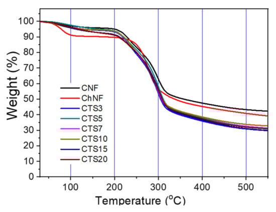 The thermal stability of ChNF, CNF and their composites were examined by TGA, and the results are shown in Figure 9. At 30 to 100 °C of the evaporation stage, there was no significant difference in the first stage of water evaporation in the composites except ChNF. The CNF and their composites started to degrade around 200 °C and reached around 320 °C for the first phase of degradation, while ChNF started to degrade near 250 °C. The composites showed almost the same thermal degradation range as the CNF. It can be seen that they are stable up to 250 °C. Note that the CNF and ChNF exhibited larger residuals than the composites. The residuals after 320 °C was around 40–50% for CNF and ChNF. The reason for larger residuals of the CNF and ChNF than the composites is under investigation.