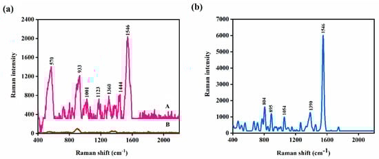 (a) Surface-enhanced Raman spectroscopy (SERS) spectra of (A) 200 μg/mL (5 × 10−4 M) of meropenem (MPN) on plasmonic nickel foam, and (B) bare plasmonic nickel foam. (b) Direct Raman spectrum of raw MPN.