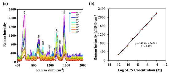 (a) Trend of SERS signal intensity of MPN in aqueous solution (concentration range; 5 × 10−4 M–1 × 10−12 M); (b) SERS calibration plot of MPN within the same concentration range.