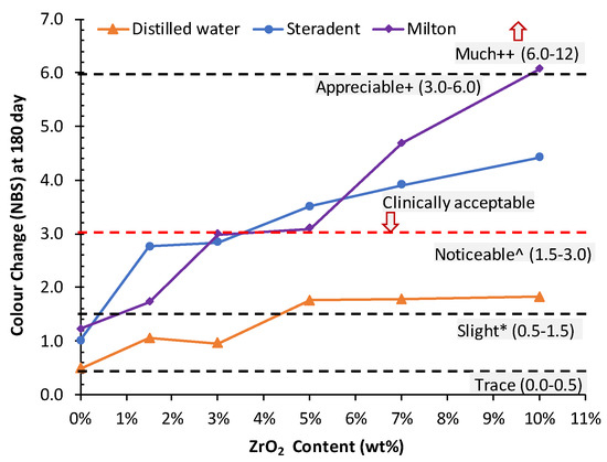 In this study, there was a significant difference in the colour stability of HI PMMA nanocomposites with different concentrations of ZrO2 when stored in different storage media, therefore the hypothesis was rejected. The colour changes of all experimental groups increased as the storage time increased. In addition, specimens stored in STD and MIL cleaners showed more colour change than those stored in DW (Figure 1). The control group exhibited less colour change (ΔE) after 180 days storage in cleaners, whereas groups containing 1.5 wt.% and 3 wt.% of ZrO2 demonstrated clinically acceptable colour change, the group containing 5 wt.% of ZrO2 showed colour change slightly above the clinically acceptable value, and the groups containing 7 wt.% and 10 wt.% of ZrO2 showed colour change above the clinically accepted values (Figure 2).