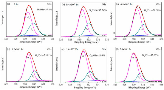 The asymmetrical high-resolution XPS spectra of O 1s corresponding to films of various oxygen partial pressure of (a) 0 Pa, (b) 0.4 × 10−2 Pa, (c) 0.8 × 10−2 Pa, (d) 1.2 × 10−2 Pa, (e) 1.6 × 10−2 Pa and (f) 2.0 × 10−2 Pa.