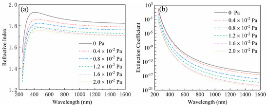 As shown in Figure 6, the refractive indexes and the extinction coefficients of the films deposited at different oxygen partial pressures were measured by ellipsometry in the band range of 250–1600 nm. The Figure 6a displays the dispersion curves of the refractive indexes. It is shown that all dispersion curves ascend along with the increase of wavelength in the near-ultraviolet range (240 nm < λ < 400 nm), and then descend in the visible and near-infrared range (400 nm < λ< 1650 nm), which implies that the films have a stronger absorption characteristic in the ultraviolet range and have a better transparent property in the visible and near-infrared range. This result can be further proved by the change trend occurrence in the dispersion curves of extinction coefficients plotted in the Figure 6b. Moreover, each dispersion curve declines lower than another with the increase of oxygen partial pressure, which demonstrates that the refractive index of the Ga2O3 films can be modulated through varying oxygen partial pressure. As shown in the Figure 6, the refractive indexes were 1.839, 1.803, 1.775, 1.740, 1.724 and 1.717 at the wavelength of 1046 nm corresponding to the oxygen partial pressure of 0, 0.4 × 10−2, 0.8 × 10−2, 1.2 × 10−2, 1.6 × 10−2 and 2 × 10−2 Pa, respectively. With the increase of oxygen partial pressure, the change trend of the refractive index could be properly described by a fitting line shown in the Figure 7, which is expressed as the following quadratic formula:
