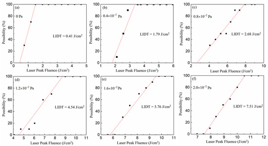 The relationship between laser energy and damage probabilities of different films deposited at (a) 0 Pa, (b) 0.4 × 10−2 Pa, (c) 0.8 × 10−2 Pa, (d) 1.2 × 10−2 Pa, (e) 1.6 × 10−2 Pa and (f) 2.0 × 10−2 Pa.