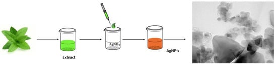 Arreche et al. studied two commercial brands of yerba mate (Ilex paraguariensis) for the preparation of aqueous extracts to synthesize AgNPs at room temperature using AgNO3 (Figure 2). The obtained NPs were spherical, hexagonal, and triangular, with an average particle size of 50 nm and surface plasmon peak at 460 nm. Additionally, the antimicrobial activity was evaluated against Escherichia coli and Staphylococcus aureus. The minimum inhibitory concentrations required for E. coli were 7.66 and 17.66 μg·mL−1 using the treatment brand 1 and brand 2, respectively. On the other hand, the values for S. aureus were 23.25 and 50.60 μg·mL−1 for the treatment brand 1 and brand 2, respectively. The study suggests that polyphenols present in yerba mate leaf extract take action as a reducing agent and stabilizer of the NPs [].