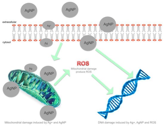 AgNPs antimicrobial mechanism through bacterial cell membrane penetration, interruption of the respiratory chain, and DNA damage by reactive oxygen species (ROS) [].