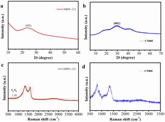 The crystal structure and graphitization degree of NRPC-112 and CN800 were analyzed by X-ray diffraction and Raman spectroscopy (as shown in Figure 6). As shown in Figure 6a,b, the diffraction peaks appear at 2θ = 20–30°, which were assigned to the (002) plane of graphitic carbon. The position (angle) of the (002) band was believed to be related to the inter-lamellar spacing [27], indicating that NRPC-112 and CN800 have amorphous structure and the degree of graphitization is low. The Raman spectra show that the IG/ID value of NRPC-112 is 1.18 as shown in Figure 6c. Raman spectra of CN800 (Figure 6d) show that the two characteristic peaks occur in 1350 cm−1 (G-band) and 785 cm−1 (D-band). While for NRPC-112, those two peaks occur in 1580 cm−1 (G-band) and 1300 cm−1 (D-band). The D-band is from the vibration of carbon within defects. While the G-band is from the vibration of in plane sp2 hybridized carbon in microcrystalline structure. The D-band is related to the degree of crystal defects, while the G-band represents the microcrystalline structure. The ratio of G-peak to D-peak (IG/ID) reflects the degree of defect and graphitization. The IG/ID value of CN800 is 1.08, which indicates that CN800 doped with N and O has typical amorphous structure and relatively low graphitization degree. It further shows that the prepared carbon materials have amorphous structure, there are defects in the material, and the existence of defective structure is conducive to ions transmission and the adsorption of pollutants.