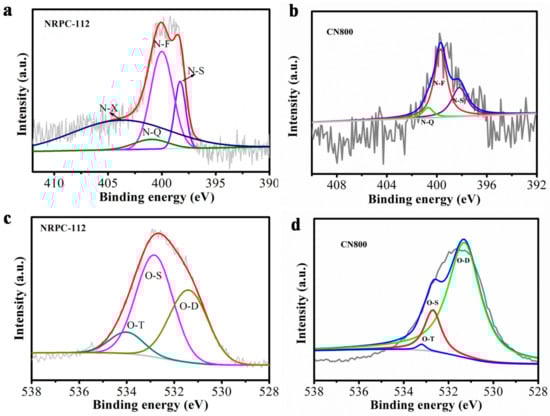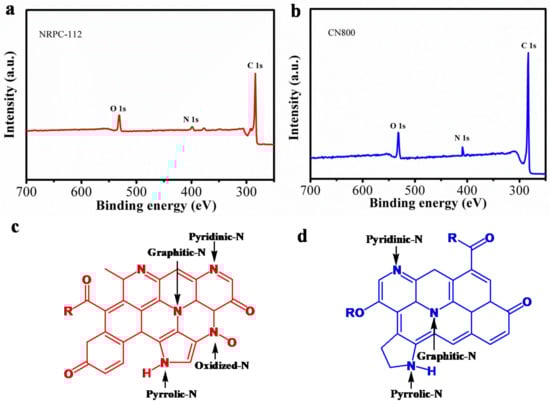The surface chemical properties of NRPC-112 and CN800 were characterized by XPS. As shown in Figure 7a,b, three characteristic peaks were observed at 285 eV, 400 eV and 533 eV, which correspond to C 1s, N 1s and O 1s, respectively [28,29,30]. Then the types of nitrogen and oxygen were distinguished with high resolution scans (Figure 8).