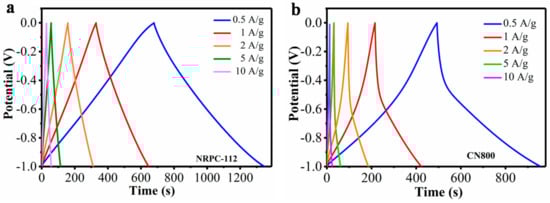 Galvanostatic charge/discharge (GCD) profiles of NRPC-112 and CN800 were shown in Figure 9. NRPC-112 electrode was chosen to evaluate its supercapacitors properties due to its superior electro-chemical performance. Figure 9a showed the GCD curves of NRPC-112 at various current densities. It was found that the GCD curves of NRPC-112 showed quasi-isosceles shape as the current density increasing from 0.5 A g−1 to 10 A g−1, illustrating that the sample had good coulombic efficiency and decent double-layer capacitive performance. Furthermore, from the GCD results at current density of 0.5 A g−1, the NRPC-112 exhibited the largest gravimetric capacitance (Cg) values (340 F g−1). Figure 9b showed the GCD curves of CN800 at various current densities. It was found that the GCD curves of CN800 showed irregular shape as the current density increasing from 0.5 A g−1 to 10 A g−1, illustrating that the charge/discharging process is not a completely equivalent process. The resistance of ion movement is different during the charge and discharge process. In addition, from the GCD results at current density of 0.5 A g−1, the CN800 had the largest gravimetric capacitance (Cg) values (246 F g−1).