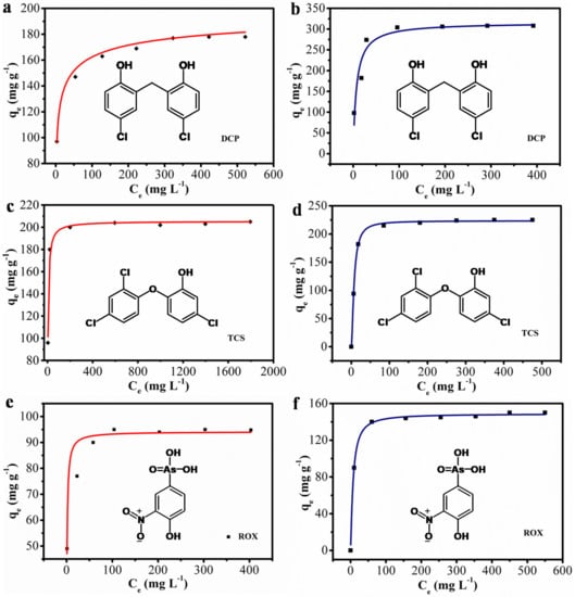 Equilibrium adsorption isotherms of NRPC-112 (a) dichlorophene (DCP), (c) triclosan (TCS), (e) roxarsone (ROX), Equilibrium adsorption isotherms of CN800 (b) DCP, (d) TCS, (f) ROX.