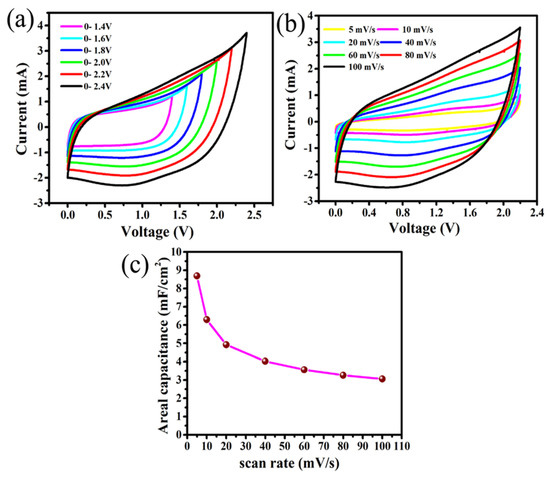 For practical applications, the electrochemical study of a supercapacitor cell using two-electrode measurements are more reliable to investigate the electrochemical properties of the electrodes, including the synthesis method, than those of three electrode measurements [2,37]. The electrochemical performance of this flexible supercapacitor (FSC) cell based on Mn/MnOx@Graphite foil electrodes and polymer gel electrolyte is given in Figure 2. A series of CV measurements (Figure 2a) of this symmetric pouch-cell supercapacitor device were performed by applying different potential windows varying from 0–1.4 to 0–2.4 V at 80 mV/s to estimate the maximum stable operating potential window of this FSC. It is well-known that a higher stable potential window extends the desired output as an alternative to the series combination of devices [25,38]. In this present case, no obvious increase in positive current (anodic current) due to any polarization has been observed even at 2.2 V for this SC, which implies that this SC device can be performed up to a wide stable potential window of 0–2.2 V. Therefore, this potential window (e.g., 0–2.2 V) is chosen for safe and stable results at further electrochemical investigations of the FSC with a polymer gel electrolyte in 1:1 ratio of [EMIM][TFSI]:PPC. Figure 2b shows this all-solid-state FSC measured at different scan rates from 5 to 100 mV/s within the chosen potential window of 0–2.2 V yields almost rectangular CV curves at each scan rate, suggesting its excellent rate capability and reversibility. The maximum capacitance contribution from pseudocapacitance can be confirmed by the presence of broad redox peaks in this potential window of up to 2.2 V at each scan rate. The increase in capacitive current with increasing scan rate from 5 to 100 mV/s is also observed, implying the promising capacitive behaviour of this FSC. The needle-like structures of the Mn/MnOx electrodes provide a high surface area with a high number of nanopores for the maximum diffusion of electrolyte ions from [EMIM][TFSI]: PPC polymer gel electrolyte at the electrode/electrolyte interface, leading to high capacitance values. The scan-rate-dependent areal capacitance (CA) of this device was calculated from CV curves using Equation (1).