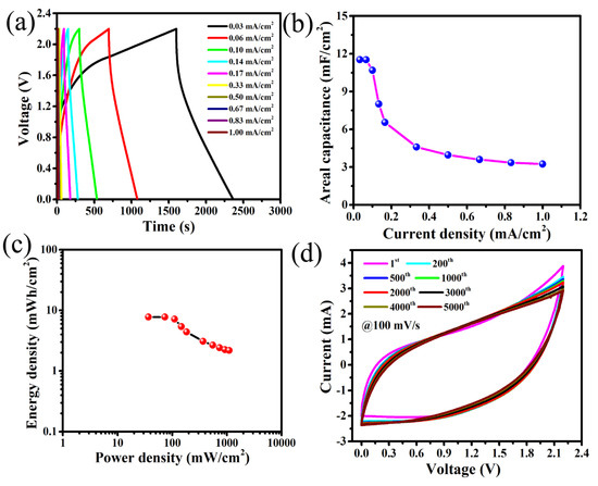A maximum areal capacitance of 8.69 mF/cm2 is obtained at 5 mV/s for this SC. The variation in CA with scan rate (Figure 2c) shows that areal capacitance values decrease significantly with increasing the scan rate due to decrease of time involvement for the movement of electrolyte ions [4,39,40]. To further evaluate the areal capacitance (CA) of this all-solid FSC device, the galvanostatic charge–discharge (GCD) tests at different current densities from 0.03 to 1.0 mA/cm2 were carried out. The GCD curves in Figure 3a show the obtainment of nearly linear and symmetric shape at different curve densities, suggesting almost ideal capacitive behaviour from this FSC. The areal capacitance of this device was evaluated from the discharge curve at different current densities using Equation (2). The variation in CA with current densities (Figure 3b) represents that CA value decreases with increase in current density due to the time limitation of electrolyte ions’ movement within the electrode pores [41,42]. The maximum CA 11.71 mF/cm2 at 0.03 mA/cm2 was achieved, which is almost equal to the value calculated from CV curve at 5 mV/s. The Ragone plot (Figure 3c) calculated from GCD curves using Equations (3) and (4) of this FSC exhibits the highest areal energy density (Ea) of 7.87 mWh/cm2 at an areal power density (Pa) of 36.65 mW/cm2 and still maintains 2.84 mWh/cm2 at a higher power density of 1099.64 mW/cm2. To our best knowledge, there is no other higher reported value of energy and power densities obtained for a MnOx-based SCs with this wide a stable potential window of up to 2.2 V than the one we now report, with this all-solid flexible SC having the direct sputter-grown needle-like Mn/MnOx@Graphite-foil electrode and polymer gel electrolyte (see Supplementary File, Table S1). Moreover, relying on the over 5000 cycles that were performed with CV measurements at a scan rate of 100 mV/s (Figure 3d), it is foreseeable that this symmetric SC cell of Mn/MnOx@Graphite-electrode and ionic-liquid-embedded polymer gel electrolyte promise long-term cycling stability. The CV curves remain almost the same for all throughout these cycles. The slight shift in the CV curves and the insignificant loss of capacitance may be due to electrochemical dissolution of the Mn/MnOx electrode materials.