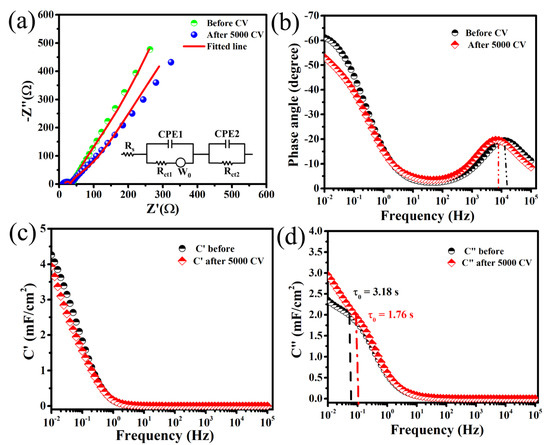 (a) Electrochemical imprudence spectroscopy (EIS) before and after 5000 cycles with equivalent circuit (inset), (b) Bode plots, (c) Real part of capacitance (C′) vs. frequency and (d) Imaginary part of capacitance (C″) vs. frequency of FSC based on polymer electrolyte gel and Mn/MnOx@Graphite-foil electrodes.