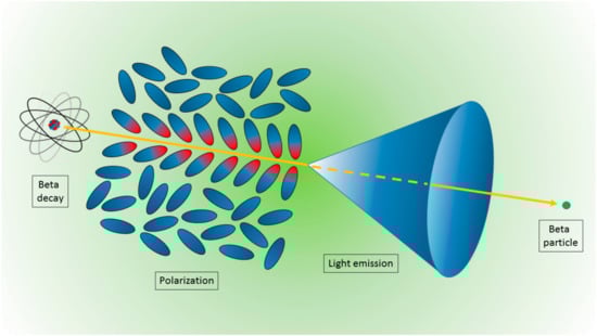 The mechanism of CR production is rather unique with respect to other, more commonly used charged particles and matter interaction mechanisms [7]. In this case, when a charged particle (for preclinical imaging, typically a beta particle) travels through a dielectric medium, the material becomes locally polarized, with the atoms comprising the medium behaving like elementary dipoles (Figure 1). If the particle’s speed exceeds the speed of light in the medium, the polarization field becomes asymmetric along the particle track, producing a dipole field at larger distances from the track. In this case, the radiation is emitted at a characteristic angle θ expressed by: