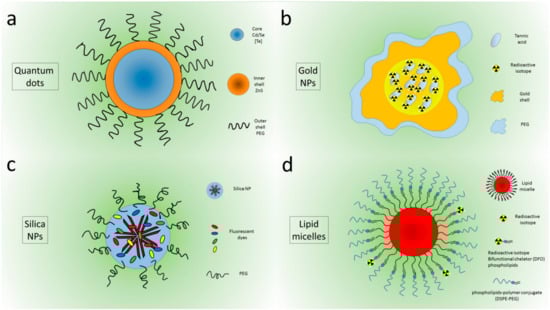 A plethora of NPs or nanocompounds were tested to evaluate their interaction with CR sources, both for imaging and therapeutic purposes. The first attempts were made using quantum dots (QDs), because they are very bright and stable [9]. QDs are composed of a CdSe 1–6 nm-sized core, sometimes containing Te to shift the emission toward the 750–800 nm wavelength, which is useful for in vivo applications. Outside the core, their structure presents an inner shell of ZnS and an outer shell often composed of polyethylene glycol (PEG) to improve biocompatibility (Figure 2a).