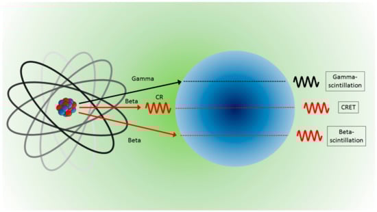 More precisely, radionuclides and NPs can interact in various ways to produce light. NPs can convert the energy released from gamma radiation (gamma scintillation) or beta particle (beta scintillation) into visible photons, or NPs can be excited from photons produced by beta particles (Cerenkov radiation) and deexcited to emit visible photons (with longer wavelengths) via the so-called Cerenkov radiation energy transfer (CRET). A schematic of the possible interaction is illustrated in Figure 3. In any case, considering the form of energy reaching and emitted by the NPs, interactions can be categorized into two processes: photon–photon and beta–photon emission. For a detailed description of the physical processes behind each kind of interaction, see the work of Pratt et al. [25] and the complete review of Ferreira et al. [39].
