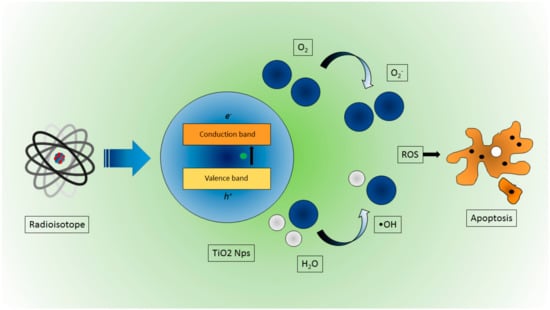 - Kavadiya, S.; Biswas, P. Design of Cerenkov radiation–assisted photoactivation of TiO2 nanoparticles and reactive oxygen species generation for cancer treatment. J. Nucl. Med. 2019, 60, 702–709. [Google Scholar] [CrossRef] [PubMed]