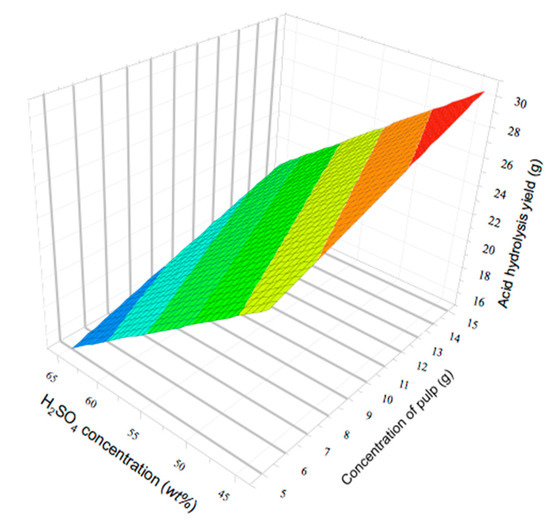 Response surface indicating acid hydrolysis yield as a function of sulfuric acid concentrations and initial concentration of pulp of cellulose. The other factors were kept constant: Time: 65 min; Temperature: 60 °C and time of sonication 20 min.