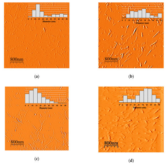 The morphology for CNCs samples was examined using an atomic force microscope (NaioAFM, Nanosurf, Liestal, Switzerland). The equipment was operated in phase-contrast mode using PPP-FMAuD Gold Coated Force Modulation AFM Probes (Nanosensors, Neuchâtel, Switzerland) at a resonance frequency of 75 kHz, spring constant of 2.8 N m−1 and tip radius of about 7 nm. For this purpose, the original CNCs solution was diluted fivefold with deionized water and sonicated for 30 minutes. Then, one drop of the diluted solution was incubated for 3 minutes on muscovite mica substrates (Grade V1, SPI supplies, West Chester, PA, USA), and then was gently dried with nitrogen. After this procedure, the samples are ready for AFM data acquisition, where the time of each essay was 310 ms per line, and each micrograph has 1024 lines of resolution. The CNC diameters were analyzed using AFM images, to do this, the images were processed using the ImageJ software (Fiji distribution, open-source) and the number of measurements for each sample was made according to standard ISO/TR 19716: 2016.