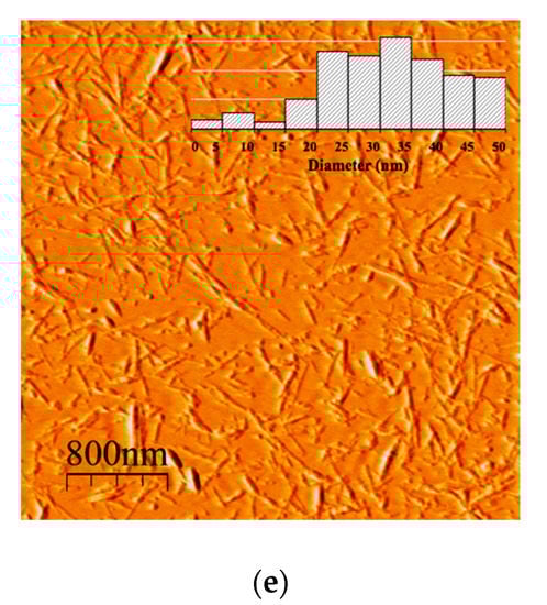 Atomic force microscope (AFM) images of the CNCs were analyzed. Each AFM image contains its graph of diameters size distribution. (a) Sample A; (b) sample B; (c) sample C; (d) sample D and (e) sample E.