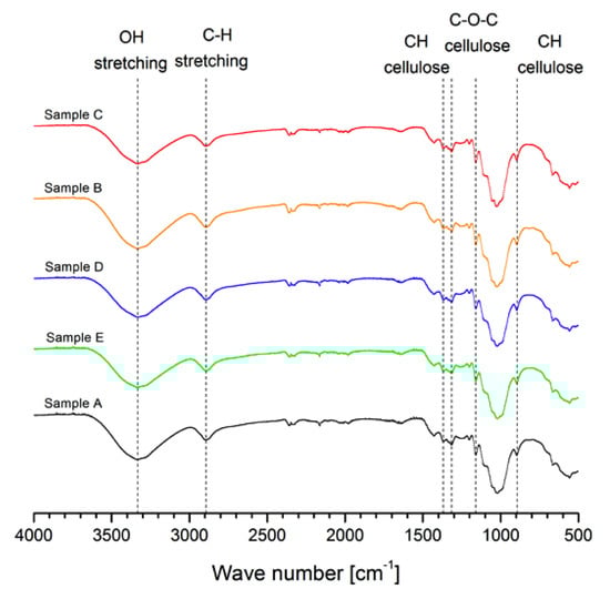 The FTIR spectra of CNC samples are illustrated in Figure 3. The spectrum in the range 3400–3300 cm−1 is related to the stretching vibration of O-H groups having strong inter and intramolecular H-bonding in cellulose type I [22,23,29]. The stretching frequency at 2900 cm−1 was due to the symmetric C-H vibrations. The bond observed in the range of 1420–1430 cm−1 was attributed to the symmetric bending of CH2 and was also related to cellulose type I [41,42], the band at 1330–1380 cm−1 corresponded to the bending vibrations of the C-H and C-O groups of the polysaccharides [21,43], and the band at 1160 cm−1 is due to C-O-C asymmetric vibrations associated with cellulose I and cellulose II [29,43]. The band at 900 cm−1 indicates the typical structure of cellulose with β-glycoside bonds of glucose ring within the cellulose structure [23,44,45]. The FTIR spectra studied indicate that CNCs were successfully extracted from the hydrolysis treatment without secondary product formation.