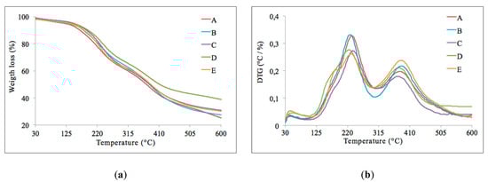 Thermogravimetric (TG) and derivative thermogravimetric (DTG) profiles obtained the five CNC samples are shown in Figure 5. There was a slight drop in the temperature near 100 °C in which indicates the evaporation of water. In all the CNC samples, two stages of CNCs degradation are observed. Similar antecedents have been reported by Kargarzadeh et al. [21] and Lin et al. [49]. The first stage presents a maximum peak of degradation temperature around 230 °C, and the second stage presents a maximum peak of degradation temperature above 350 °C (Figure 5b). The significant weight loss for CNCs was in the temperature range of 230–385 °C, and the samples underwent weight loss between 65% and 75% (based on dry weight). The presence of sulfate groups on the CNC surface might be a disadvantage for some applications since it favors its decomposition at lower temperatures [12,29,50].