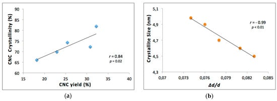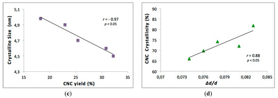 In CNC production, hydrolysis is a chemical process that increases mechanical stress on cellulose microfibrils. Therefore, in this process, CNCs are subjected to mechanical stress when separating from microfibrils, implying that Δd/d increases, the latter being a measure of the microstrain of the crystal lattice that characterizes the average deformation within the crystallites of the CNCs. Therefore, with greater mechanical stress, Δd/d increases and the crystallite size decreases. This observation can be verified in Figure 6b, where crystallites size versus fractional variation in their interplanar distance (Δd/d) showed a significant but negative Pearson correlation of r = −0.99; p < 0.01. In literature, the importance of the potential variation between the distances of the crystalline planes in CNCs has been discussed, which affect properties in materials developed using these CNCs [52]. On the other hand, in the case of our data, the CNC yield may be related to the mechanical compression on the microfibrils during hydrolysis, and for this reason, the crystallite size decreases with increasing CNC yield (Figure 6c). In this sense, the increment in crystallinity is related to the average stress generated, since a higher CNC yield supposes a greater crystalline portion generated compared to the amorphous amount of cellulose obtained. Therefore, increasing yield is related to large mechanical stress on microfibrils, leading to an increase in the average deformation of crystallites of CNCs (Figure 6d).