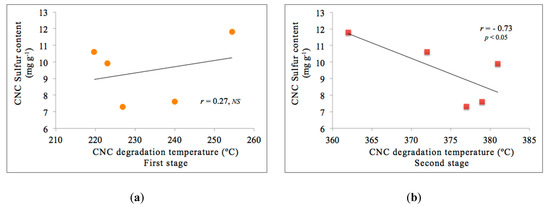 Understanding the sulfate groups introduced on the CNC surface has become essential to evaluate the thermal degradation behavior of crystals prepared by sulfuric acid hydrolysis. According to data reported in this study, it is possible to observe two stages in CNCs thermal degradation (Figure 5b). The first stage corresponds to the degradation of the more accessible and sulfated amorphous regions. The second stage is related explicitly to the degradation of the unsulfated crystal [21,50], or also, to enhance access to the crystal interior due to the degradation of sulfated regions at the ends of crystals under harsh hydrolysis conditions [50]. Figure 7 shows the plots of the CNC sulfur content versus CNC degradation temperature in the first stage and the second stage from the profile analysis of DTG curves. In fact, a significant but negative Pearson correlation is observed in the second stage of CNCs degradation (r= −0.73; p < 0.05), confirming the degradation of the CNCs at this stage. This information is consistent with the thermal behavior of the CNC reported in the literature, since the presence of sulfate groups grafted on the CNC surface facilitates its decomposition, which means that at higher sulfur contents, the kinetics of degradation is accelerated. This correlation is not observed in the first stage of CNC degradation, Figure 7a (r = 0.27; NS = not significant).