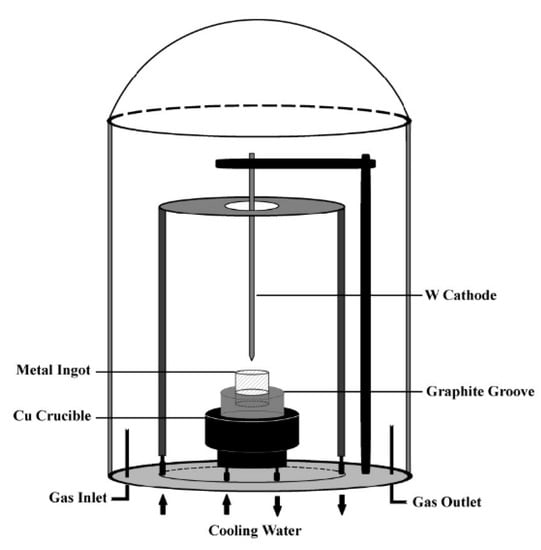 The plasma-assisted arc discharge process was performed in a modified experiment apparatus that consisted of a stainless-steel chamber with two electrodes facing each other, lined up in a vertical configuration. A schematic diagram of the experiment setup is shown in Figure 1 [27]. A tungsten rod (purity: 99.995%, 5 mm diameter and 30 cm length) was at the top as the cathode. Platinum foils (purity: 99.999%, 10 mm thickness and 30×30 mm size) were nipped by platinum arms that were fixed inside a water-cooled copper crucible as the anode. After the chamber was evacuated, helium gas (He, purity: 99.999%) was introduced as a working gas to reach the desired pressure. During arc discharge (18 V voltage, 120 A current, and 40 kPa helium pressure), platinum foils were evaporated, and the gap between the electrodes was kept constant (1 mm) by manually advancing the consumed anode. This process was maintained for 2 min; after that, the evaporated materials were quenched by helium for 5 h and deposited on the wall of the chamber.