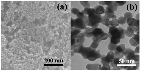 A typical SEM image of the as-synthesized sample is shown in Figure 3a, which mostly exhibited a uniform spherical morphology. From the TEM image in Figure 3b, it is apparent that the nanoparticles had a smooth surface and a diameter of 20–30 nm, which is consistent with the previous XRD data.