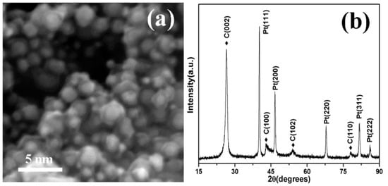 (a) SEM and (b) XRD of carbon-encapsulated ultrafine Pt nanoparticles.