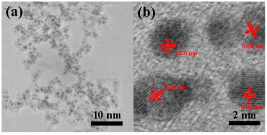 Encapsulation could be observed more directly by TEM. As shown in Figure 5a, Pt UFPs are separated from each other by the carbon shell. To further elucidate the structure of the central nanoparticles, a corresponding HRTEM were performed. As shown in Figure 5b, Pt UFPs with a diameter of 2 nm were confirmed as single-crystal; the distance between adjacent lattice planes was about 0.131 nm, which agreed well with the d-spacing of cubic Pt. It means that the central nanoparticle remained as a metal rather than carbide after the secondary discharge process, which was consistent with the SEM results. Meanwhile, the potential chemical activity of Pt UFPs was confirmed.