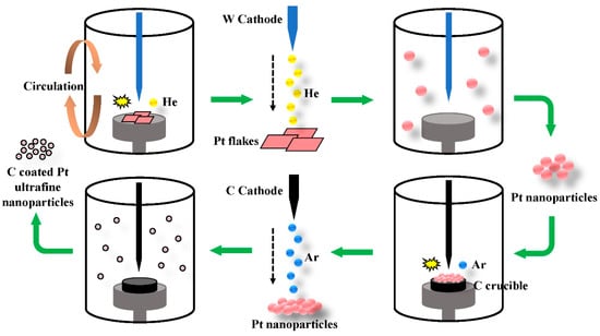 In terms of the sample characterizations and arc discharge features, a possible growth mechanism of the carbon-encapsulated Pt UFPs is proposed as illustrated in Figure 6. When the arc discharge was ignited, the Pt foils were struck by high-energy plasma helium (He) and drastically evaporated in the central high-temperature zone. With circulation, Pt vapors were transported by the He carrier gas to the water-cooled collecting wall and formed 25 nm Pt nanoparticles. To further reduce the size of Pt nanoparticles and prepare the carbon-encapsulated Pt UFPs, a second discharge was performed. In this process, the tungsten rod cathode was replaced by the carbon rod, and the as-synthesized Pt nanoparticle powder was slightly pressed into an ingot as a precursor that was placed inside a graphite crucible as the anode. The carbon rod cathode and graphite crucible anode played a role in providing a carbon source. To raise the reaction temperature, the working gas was replaced by argon (Ar). When discharged again, the Pt nanoparticles were hit by Ar plasma, and formed the 5 nm carbon-encapsulated Pt UFPs on the surface of the water-cooled collecting wall. The crucial preparation factor of carbon-encapsulated Pt UFPs was the ingenious design of the precursor. In the traditional arc discharge method, encapsulated objects are usually bulk materials that discharge only once. In this work, nano-treated precursors had characteristics of a higher chemical activity, lower melting point, and easier reassembly of UFPs, which allowed for their recombination with carbon into a core–shell structure.