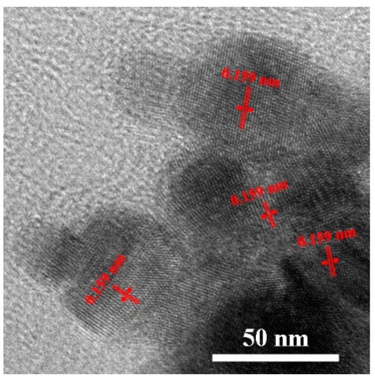 To further elucidate the microstructure of PtNx, HRTEM investigations were performed. As shown in Figure 9, PtNx nanoparticles present a series of clear lattices and which were confirmed as single-crystal; the distance between adjacent lattice planes was about 0.159 nm, which is larger than Pt UFPs and agreed well with the d-spacing of Zn-S type PtNx. It means that PtNx nanoparticles are still in the cubic crystal system as metal Pt, which is consistent with previous reports [8,9].
