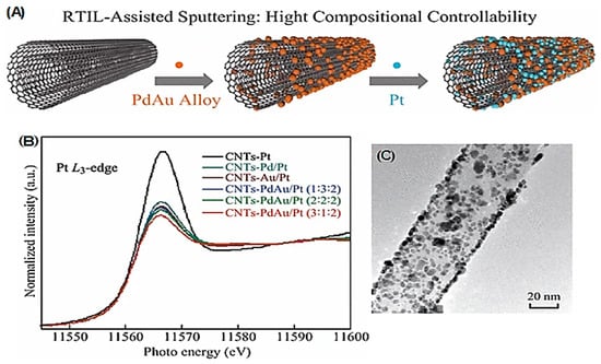 Figure 1. (A) The process of CNTs-PdAu/Pt NPs preparation, (B) Pt L3-edge X-ray absorption near edge structure (XANES) spectra of CNTs-supported PdAu/Pt trimetallic NPs, (C) TEM image of CNTs-PdAu/Pt NPs, Adapted from [76], (CC BY 4.0).