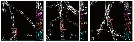 Figure 2. High-angle annular dark field scanning TEM (HAADF-STEM) images and regional elemental mapping of the Au, Pd, and Pt content of CNTs-PdAu/Pt trimetallic NPs with different Pd/Au/Pt ratios: (a) 1:3:2, (b) 2:2:2, and (c) 3:1:2 Adapted from [76], (CC BY 4.0).