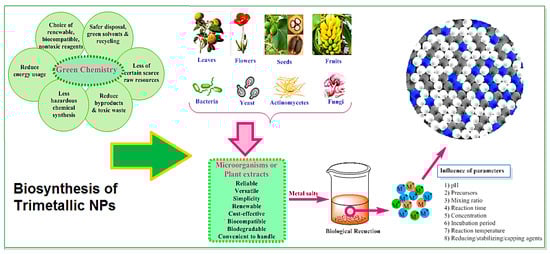 Green chemistry provokes the application of renewable materials to fabricate assorted nanomaterials with unique properties [65,66,67,68,69]; formation of trimetallic NPs via greener approaches deploying renewable resources is an ecologically beneficial undertaking [70,71,72]. In this review, state-of-the-art sustainable and greener syntheses of trimetallic NPs are discussed as well as their promising applications and associated important challenges.