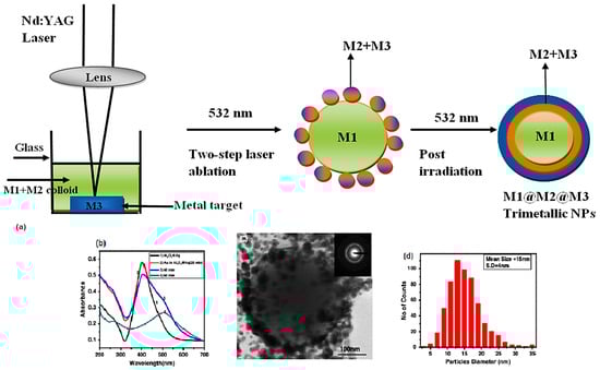 Figure 5. (a) The fabrication process of trimetallic nanoarchitectures by applying multiple-step laser ablation technique. (b) UV–VIS spectra, (c) TEM image, and (d) size distribution of Al2O3@AgAu NPs in deionized water. Reproduced from [100], with permission from Springer Nature, 2014.