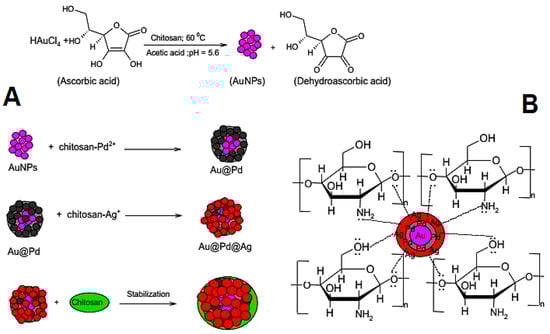 Figure 6. Schematic representation of seedless formation of Au-Pd-Ag NPs (A) and their stabilization using chitosan as capping agent (B). Reproduced from [103], with permission from Elsevier, 2020.