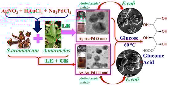 Trimetallic NPs have recently garnered more attention as promising nanocatalysts in oxidation, degradation, and reduction reactions. In one study, alloyed metal NPs displayed excellent structural and physical features as compared to their bulk counterparts, e.g., improved solid solubility with reduced particle size [105]. Additionally, the green-fabricated and well-dispersed Ag-Au-Pd alloy NPs were obtained in a simple one-step protocol using the plant extract of S. aromaticum bud (CE) and A. marmelos leaf extracts (LE) as stabilizing/bioreducing agents and Acacia auriculiformis as a natural surfactant (Figure 7) [88]. The catalytic performance of Ag-Au-Pd trimetallic NPs achieved from LE (with a 5.26:2.16:1.0 atomic ratio) and LE+CE (with a 11.36:13.14:1.0 atomic ratio) were tested as a nanocatalyst for glucose oxidation process to afford gluconic acid under gentle circumstances without any external aeration. Further, the as-prepared trimetallic NPs revealed efficient antibacterial activities against Escherichia coli as a model Gram-negative bacterium [88].