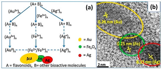 Figure 8. (a) Role of A. membranaceus for the Au-Fe-Ag NPs formation. (b) High-resolution TEM (HRTEM) image of Au-Fe-Ag NPs with D-spacing. Reproduced from [108], with permission from Elsevier, 2015.